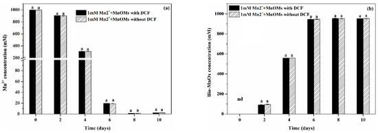 Concentration variation of (a) Mn2+ and (b) Bio-MnOx over time. The same letters above the error bars showed insignificant differences between control and treatment (p < 0.05).