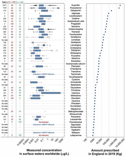 Top 50 neuroactive pharmaceuticals dispensed in England and their concentrations in surface waters worldwide. (Left panel) Measured concentrations of neuroactive pharmaceuticals in surface waters worldwide (μg/L). The range of concentrations is visualised as box plots, where the limits indicate the 5th and 95th percentiles of the data distribution. Data points outside this range are visualised as individual dots. The vertical line in each box indicates the median value. The data were extracted from the PHARMS-UBA database curated by the German Environment Agency (Umweltbundesamt–UBA) and represent only the values generated by scientific reports classified as “good literature credibility” by the database curators. For each pharmaceutical, the figure indicates the number of available datapoints in the database (first column), the percentage of data above the limit of detection (second column), and the percentage of data below the limit of detection (third column). (Right panel) Top 50 neuroactive pharmaceuticals prescribed in England in 2019 and ranked by dispensed amount (kg). The data were generated by analysing the Prescription Cost Analysis (PCA) report (year 2019) provided by the National Health Services (NHS) of England (United Kingdom) and published by the NHS Business Services Authority.