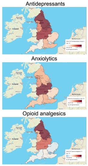 Regional differences in the prescription volumes of three selected classes of neuroactive pharmaceuticals (antidepressants, anxiolytics, opioid analgesics) in England in April 2021. The maps and related data were generated using the OpenPrescribing database (https://openprescribing.net/, accessed on 1 February 2022). The volume of each class of pharmaceuticals is expressed as number of items dispensed in April 2021.