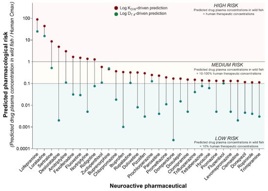 The predictions of this analysis were generated considering two different partitioning factors for each pharmaceutical, LogKOW and LogD7.4. The risk classification described above was based on the consideration of the use of LogKOW as a key parameter for the prediction of drug uptake in fish. However, the analysis revealed that the predicted pharmacological risk is highly sensitive to the use of different partitioning coefficients, so the predicted risk is lower when the LogD7.4 is used (Figure 3). Considering this scenario, the pharmacological risk of lofepramine and loratadine remained high. The predicted pharmacological risk of the other compounds decreased to a “low risk” classification, with the exception of sertraline, amitriptyline, zuclopenthixol, buprenorphine, rupatadine, prochlorperazine, and flupentixol, which all retained a “medium risk” classification.