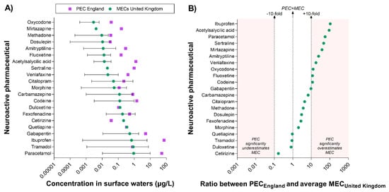UK-specific data were available for 21 out of the 84 neuroactive pharmaceuticals associated with measured surface water concentrations worldwide. The comparison of PEC and MECs indicated that PECs often overestimate MECs; however, this is not always the case. For example, the PEC of cetirizine was lower than the concentration measured in the environment. Moreover, the PECs of eight compounds (duloxetine, tramadol, quetiapine, fexofenadine, carbamazepine, morphine, citalopram, dosulepin) were within the range of MECs reported in the UK (Figure 4A).