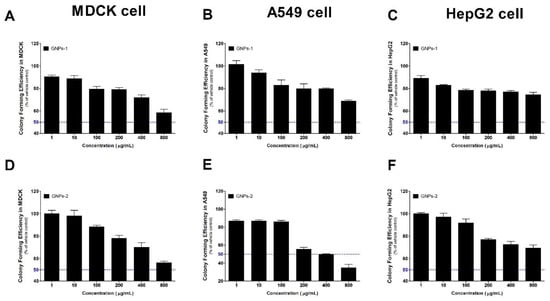 The cytotoxicity of GNPs was evaluated by performing a CFE assay using three types of cell lines. A graph of the calculated CFE compared to the vehicle control group was presented in Figure 2 and used CFE dish images for each cell line was presented in Supplementary Materials (Figures S1–S3). First, the result of the colony forming ability test using MDCK cells at a concentration of 200 cells/dish was able to obtain cytotoxicity results in a dose-dependent manner in GNPs-1 and GNPs-2. It was confirmed that A549 cells with a concentration of 400 cells/dish, which are additional cell lines other than MDCK, were capable of optimal colony count at 10 days, and optimized at eight days of 200 cells/dish in HepG2 cells. Like the MDCK results, the results of colony formation tests using two cell lines confirmed that the cytotoxicity of nanomaterials was identified in a dose-dependent manner.