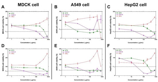 MDCK (product No. CCL-34), A549 (product No. CCL-185), and HepG2 (product No. HB-8065) cell lines were purchased from American Type Culture Collection (ATCC; Manassas, VA, USA). The cells were cultured in DMEM medium supplemented with 10% FBS, 100 U/mL penicillin and 100 μg/mL streptomycin. Three types of cells were sub-cultured every 2–4 days at about 80% confluence. For the experiments, cell density was adjusted according to the conditions of each cytotoxicity method and seeded on the 96 well culture plates or 60 × 15-mm Petri dish. Then, culture medium was replaced with a fresh medium and incubated in a humidified atmosphere condition of 5% CO2 at 37 °C.