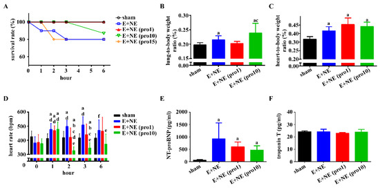 Low-dose propranolol improves overall survival and lung-to-body weight ratio. During catecholamine infusion alone or with additional propranolol over 6 h, the following data were measured. (A) Survival rate, sham, n = 6; E + NE, n = 10; E + NE (pro1), n = 7, E + NE (pro10), n = 8; E + NE (pro15), n = 10. (B,C) Organ-to-body weight ratio of the lungs and heart, respectively, in rats at the end of 6 h post-catecholamine or propranolol treatment. Sham, n = 5; E + NE, n = 6, E + NE (pro1), n = 7; E + NE (pro10), n = 7. (D) Heart rate, sham, n = 5; E + NE, n = 6; E + NE (pro1), n = 6; E + NE (pro10), n = 5. (E) Serum NT-proBNP changes, and (F) serum troponin T changes were measured in rat groups: Sham, n = 4; E + NE, n = 4; E + NE (pro1), n = 6; E + NE (pro10), n = 6. Data are represented as mean ± SD. Mann–Whitney U test was used for statistical analysis of all panels. a p < 0.05 vs. sham group; b p < 0.05 vs. E + NE group; c p <0.05 vs. E + NE (pro1) group; d p < 0.05 vs. respective group at 0 h; e p < 0.05 vs. respective group at 1 h; f p < 0.05 vs. respective group at 3 h. E + NE, epinephrine and norepinephrine; pro1, low-dose propranolol 1 mg/kg; pro10, high-dose propranolol 10 mg/kg; NT-proBNP, N-terminal pro-brain natriuretic peptide.