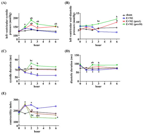Trend graphs of hemodynamic changes of the left ventricle in rat models with excessive catecholamine infusion alone or with additional propranolol treatment. Measurements of (A) left ventricular systolic pressure, (B) left ventricular end-diastolic pressure, (C) systolic duration, and (D) diastolic durations were recorded. These measurements were assessed in the following rat groups: Sham, n = 5; E + NE, n = 6; E + NE (pro1), n = 7; E + NE (pro10), n = 6. (E) Contractility indexes were measured in the following rat groups: Sham, n = 5; E + NE, n = 6; E + NE (pro1), n = 6; E + NE (pro10), n = 5. Data are represented as median. Mann–Whitney U test was used for statistical analysis of all panels. a p < 0.05 vs. sham group; b p < 0.05 vs. E + NE group; c p < 0.05 vs. E + NE (pro1) group. E + NE, epinephrine and norepinephrine; pro1, low-dose propranolol 1 mg/kg; pro10, high-dose propranolol 10 mg/kg.