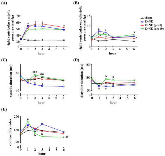 Trend graphs of the hemodynamic changes of the right ventricle in rat models with excessive catecholamine infusion alone or with additional propranolol treatment. (A) Right ventricular systolic pressure, and (B) right ventricular end-diastolic pressure, were recorded in rat groups of sham, n = 5; E + NE, n = 6; E + NE (pro1), n = 7; E + NE (pro10), n = 6. (C) Systolic durations were measured in groups of sham, n = 5; E + NE, n = 6; E + NE (pro1), n = 7; E + NE (pro10), n = 5. (D) Diastolic durations were measured in groups of sham, n = 5; E + NE, n = 6; E + NE (pro1), n = 7; E + NE (pro10), n = 6. (E) Contractility indexes were measured in groups of n = 5 for all conditions, except for E + NE (pro10), n = 6. Data were presented as median. Mann–Whitney U test was used for statistical analysis of all panels. a p < 0.05 vs. sham group; b p < 0.05 vs. E + NE group; c p < 0.05 vs. E + NE (pro1) group. E + NE, epinephrine and norepinephrine; pro1, low-dose propranolol 1 mg/kg; pro10, high-dose propranolol 10 mg/kg.