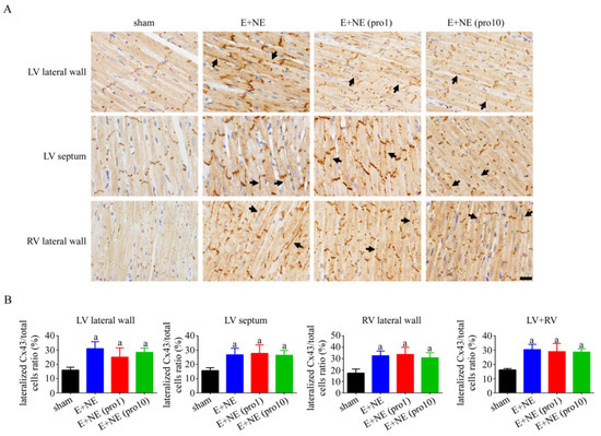 Changes in connexin 43 distribution reveal lateralization in cardiac tissue with 6 h continuous catecholamine infusion alone or with propranolol treatment. (A) Representative immunohistochemical staining with connexin 43 antibodies in cardiac tissue and (B) quantitative analysis of lateralized Cx43 in LV lateral wall, LV septum, and RV lateral wall of after 6 h in rat groups of: sham, n = 4; E + NE, n = 5; E + NE (pro1), n = 5; E + NE (pro10), n = 5. Data are represented as mean ± SD. Mann–Whitney U test was used for statistical analysis of all panels. a p < 0.05 vs. sham group. Cx43, connexin 43; E + NE, epinephrine and norepinephrine; LV, left ventricle; pro1, low-dose propranolol 1 mg/kg; pro10, high-dose propranolol 10 mg/kg; RV, right ventricle. The scale bars represent 50 μm.
