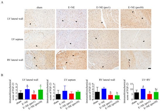Expression of fibroblast growth factor-23 (FGF-23) in cardiac tissue after 6 h infusion of catecholamine alone or with propranolol treatment. (A) Representative immunohistochemical staining with FGF-23 antibodies, and (B) the immunohistochemical scores of FGF-23 in LV lateral wall, LV septum, and RV lateral wall after 6 h in groups of: sham, n = 6; E + NE, n = 6; E + NE (pro1), n = 6; E + NE (pro10), n = 5. Data are expressed as mean ± SD. Mann–Whitney U test was used for statistical analysis of all panels. a p < 0.05 vs. sham group; b p < 0.05 vs. E + NE group; c p < 0.05 vs. E + NE (pro1) group. E + NE, epinephrine and norepinephrine; LV, left ventricle; pro1, low-dose propranolol 1 mg/kg; pro10, high-dose propranolol 10 mg/kg; FGF-23, fibroblast growth factor-23; RV, right ventricle. The scale bars represent 50 μm.