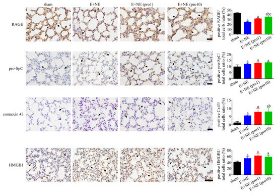 In pulmonary tissue, a significantly downregulated RAGE and an upregulation of pro-surfactant protein C, Cx43, and HMGB-1 expression were observed 6 h post catecholamine infusion. Low-dose and high-dose propranolol subsets failed to modify the expression of pro-surfactant protein C, Cx43, and HMGB-1. However, RAGE was upregulated after high-dose propranolol treatment (Figure 6).