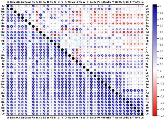 | Factor 1 (50.9%) | Rb, Cr, Li, Ba, Ga, Be, V, W; ΣHREEs, Co, Mn, Mo, Nb, Tl, Zn. | Factor 1 (81.9%) | Er, Tm, Y, Yb, Lu, Ho, Dy; Tb, Eu, Sm, La, Gd, Nd. |