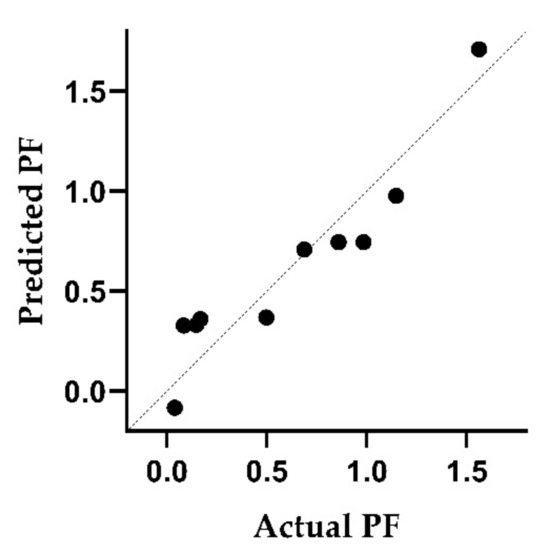 The adjusted coefficient of determination indicated that the multiple linear regression model explains 85% of the variability in the PFs for white wine. An analysis of variance (ANOVA) showed that clarification has a significant effect (p < 0.05). Figure 3 illustrates the comparison of the experimental PFs with the predicted values obtained when applying Equation (2). The influence of the use of pectolytic enzymes was also investigated, but no significant effect was observed.