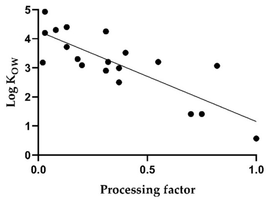 Figure 4 shows a simple linear regression between the log KOW and the median PF in red wine. The correlation is low with a coefficient of determination of 0.66 (p < 0.005). In particular, low log KOW values, as for imidacloprid and thiophanate methyl, are associated with higher PFs. On the other hand, valifenalate exhibits a relatively high processing factor of 0.82 despite a log KOW of 3.07.