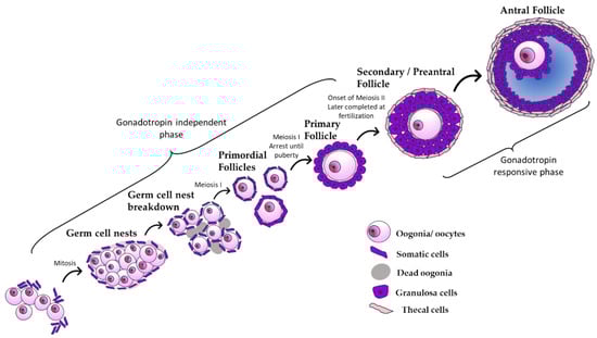 - Rimon-Dahari, N.; Yerushalmi-Heinemann, L.; Alyagor, L.; Dekel, N. Ovarian Folliculogenesis. Results Probl. Cell Differ. 2016, 58, 167–190. [Google Scholar] [PubMed]
