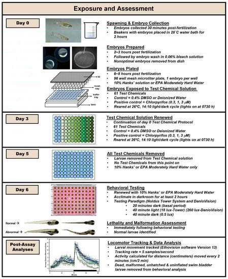 Jarema KA, Hunter DL, Hill BN, Olin JK, Britton KN, Waalkes MR, Padilla S. Developmental Neurotoxicity and Behavioral Screening in Larval Zebrafish with a Comparison to Other Published Results. Toxics. 2022; 10(5):256. https://doi.org/10.3390/toxics10050256