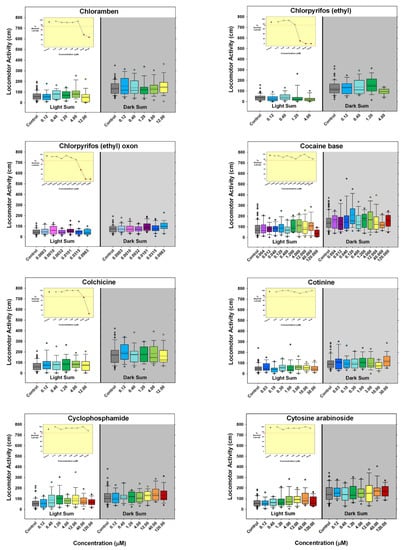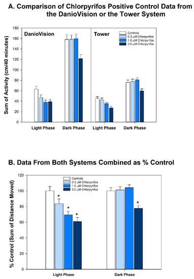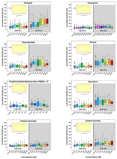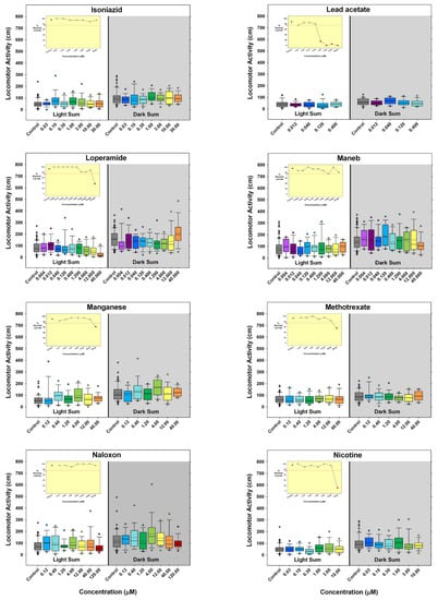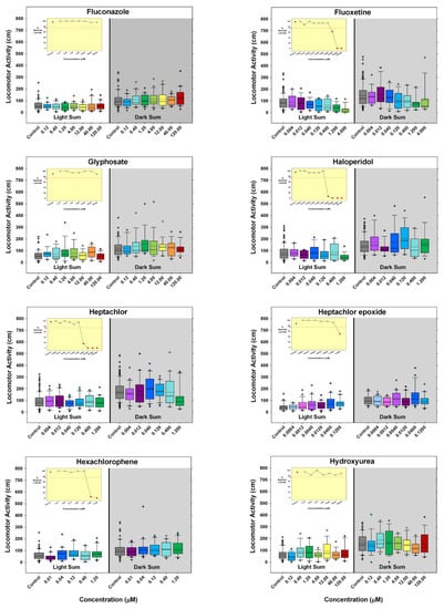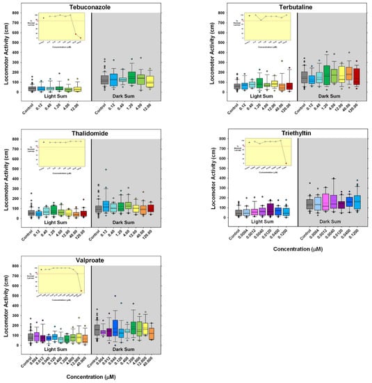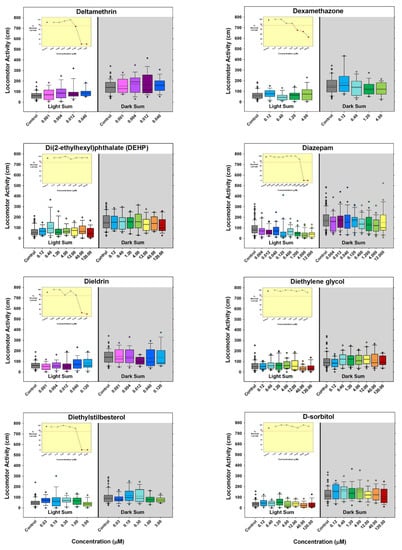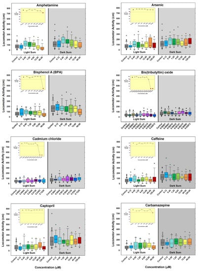 - Hill, B.N.; Coldsnow, K.D.; Hunter, D.L.; Hedge, J.M.; Korest, D.; Jarema, K.A.; Padilla, S. Assessment of Larval Zebrafish Locomotor Activity for Developmental Neurotoxicity Screening. In Experimental Neurotoxicology Methods; Llorens, J., Barenys, M., Eds.; Humana: New York, NY, USA, 2021; Volume 172, pp. 327–351. [Google Scholar] [CrossRef]