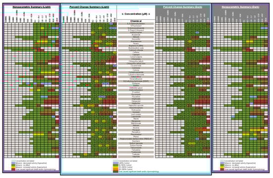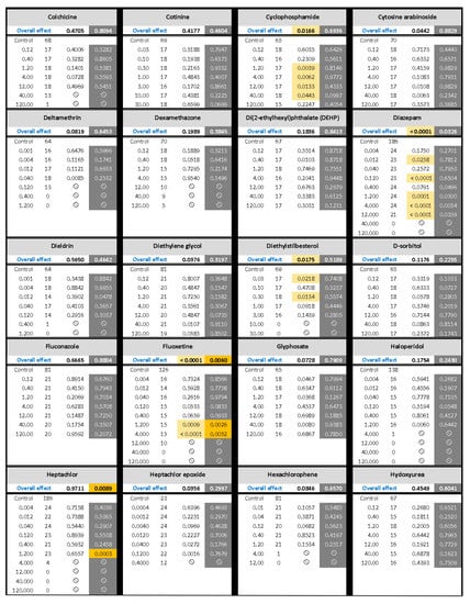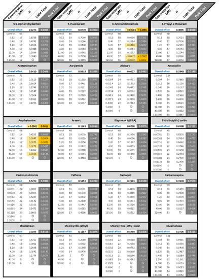 ) indicates developmental toxicity: that concentration was not included in behavioral analyses due to the number of dead, malformed and uninflated swim bladders exceeding 25%. Overall effect is listed under the chemical name followed by the sample size and results for each concentration, with the Dark period shaded gray. Statistically significant results are highlighted with the light-yellow shading in the Light period and dark-yellow shading in the Dark period.