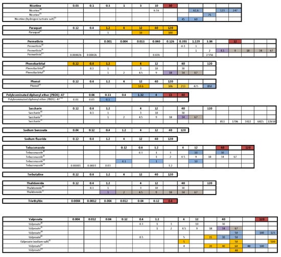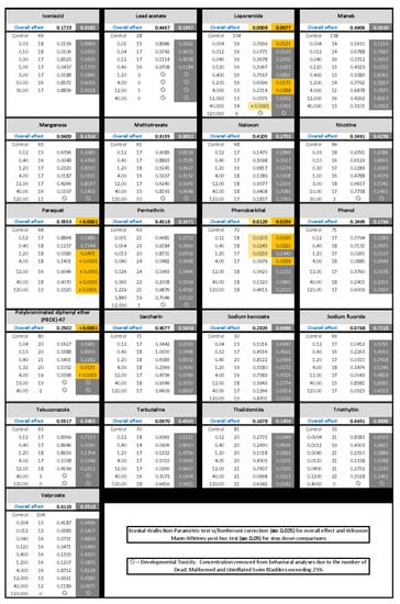 - Dach, K.; Yaghoobi, B.; Schmuck, M.R.; Carty, D.R.; Morales, K.M.; Lein, P.J. Teratological and Behavioral Screening of the National Toxicology Program 91-Compound Library in Zebrafish (Danio rerio). Toxicol. Sci. 2019, 167, 77–91. [Google Scholar] [CrossRef]