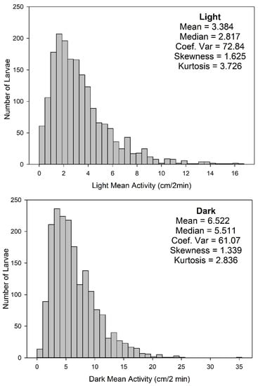 - Liu, Y.; Ma, P.; Cassidy, P.A.; Carmer, R.; Zhang, G.; Venkatraman, P.; Brown, S.A.; Pang, C.P.; Zhong, W.; Zhang, M.; et al. Statistical Analysis of Zebrafish Locomotor Behaviour by Generalized Linear Mixed Models. Sci. Rep. 2017, 7, 2937. [Google Scholar] [CrossRef]