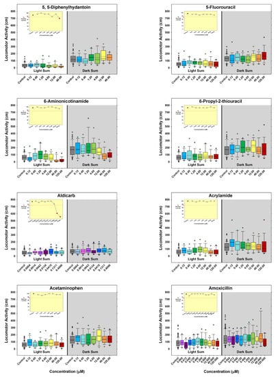 - Are there unique chemicals that only our laboratory has tested that produced changes in larval locomotor activity after developmental exposure? There were four chemicals that were tested in this publication that produced changes in locomotor activity after developmental exposure that other publications appear not to have tested: developmental exposure to 6-aminonicotinamide or loperamide produced decreased activity in the larvae, and developmental exposure to amphetamine produced an inverted “U” biphasic pattern of increased activity at lower concentrations and decreased activity at the higher concentrations. Cyclophosphamide also showed increased activity in the middle concentrations. In our laboratory embryos treated with diethylstilbesterol during development showed increased activity at concentrations below those that tested negative in other publications.