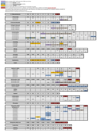 - Are there chemicals among multiple publications that consistently cause or do not cause behavioral effects? This would allow us to identify possible positive and negative controls. There were five chemicals that appear to be candidates for positive controls: diazepam, fluoxetine, paraquat, PBDE-47, and chlorpyrifos. One publication reported decreased activity for diazepam in a similar concentration range as the present study, and the other paper reported behavioral changes, but whether it was an increase or decrease in activity was unclear as only a lowest effective dose was reported. As diazepam is known to be pharmacologically active at the gamma-aminobutyric acid receptor (reviewed in [91]), perhaps diazepam could be regarded as a positive control for GABAergic chemicals. For fluoxetine, one publication, as well as our own, reported decreased activity in larvae treated with fluoxetine during development, while another publication reported increased activity in animals treated with fluoxetine transiently during an early developmental window. Some of the effective concentration ranges aligned. As fluoxetine is a serotonin reuptake inhibitor, this chemical may serve as a positive control for the serotonergic disrupting class of chemicals. Although only one other publication tested paraquat in a developmental neurotoxicity test using zebrafish, the results were very similar to the present study, with both reporting markedly increased activity in the same dosage range. As paraquat has been reported to disrupt the development of the dopaminergic nervous system (reviewed in [92]), this chemical may serve as a positive control for the dopaminergic disrupting class of chemicals. The data for PBDE-47 as a possible positive control are a bit weaker mainly because only one other publication investigated the behavioral effects of developmental exposure to PBDE-47, and the effective concentration range did not overlap with our own data; however, both noted decreased activity. The fifth chemical that might serve as a positive control among testing publications is chlorpyrifos. There are multiple reports of developmental chlorpyrifos exposure producing behavioral alterations in larval zebrafish assays, but the range of effective concentrations spans four orders of magnitude. Because chlorpyrifos is an anticholinesterase, this chemical could serve as a positive control for the disruption of the cholinergic nervous system during development. In contrast, there are four chemicals that are candidates for negative controls, although the number of observations is smaller: aldicarb, amoxicillin, hexachlorophene and hydroxyurea. In all cases, there are two publications as well as the present study showing that developmental exposure to these chemicals in approximately the same concentration range did not produce behavioral alterations in the larval locomotor assay.