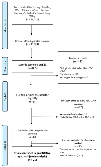 The exclusion criteria were: MDA measured in any other matrix than EBC (e.g., blood/plasma and sperm) in vitro or non-human studies (animal or plant), incorrect MDA abbreviation (e.g., mass drug administration and methylenedioxyamphetamine), and inappropriate types of publications such as reviews or conference papers. In accordance with our registered protocol, our research string was built to cover an entire series of OS biomarkers, and was not limited to MDA. Consequently, our initial pool of articles contained articles that did not refer to MDA. Another factor that made this pool large was that authors often chose keywords that were very generic such as “oxidative stress” and “biomarkers of oxidative stress”.