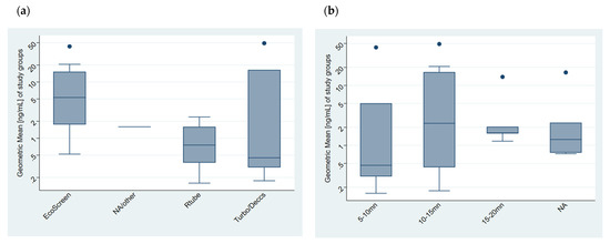 Since different factors were indicated as potential confounding factors in the literature, we wanted to assess their influence. Therefore, the results were stratified by gender, age, smoking status, EBC collection device, duration of EBC collection, use of nose clip, and analytical methods combined with their detection methods. We created a separate group identified by the abbreviation NA, meaning “not available”, which was assigned when the information was not given in the article. This resulted in the description of 28 study subgroups. Figure 2 shows the boxplots concerning the collection device (Figure 2a), duration of collection (Figure 2b), and gender groups (Figure 2c).