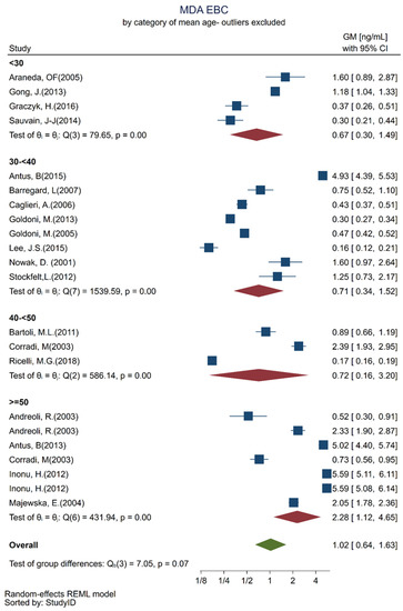 Regarding the meta-analysis itself, the first step involved estimating the geometric means (GMs), and then representing the data with forest plots since they illustrated the heterogeneity and the overall combined results from individual studies. Between-study heterogeneity was evaluated with a Q test and displayed for each category in the forest plots. Finally, we modeled the Log-transformed GMs using linear models. We reported the results in ng/mL of MDA in EBC.