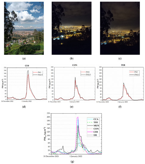 View of the city of Cuenca: (a) during the afternoon of 31 December 2021; (b) approximately 5 min before the midnight of 31 December 2021; (c) after the first 30 min of 1 January 2022. Hourly PM1 and PM2.5 concentrations on 31 December 2021 and 1 January 2022 measured at the CEB (d), CON (e), and TER (f) stations. (g) Hourly PM2.5 concentrations on 31 December 2021 and 1 January 2022.