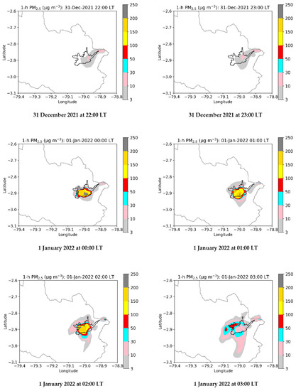 Modeled maps of hourly PM2.5 concentrations from 31 December 2021 at 22:00 LT to 1 January 2022 at 03:00 LT. Reference scenario: New Year’s emissions beginning on 1 January 2022 at 00:00 LT.