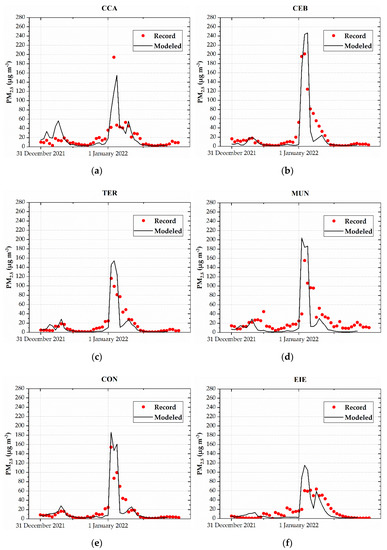 Hourly PM2.5 records and modeled concentrations from 31 December 2021 to 1 January 2022: the (a) CCA, (b) CEB, (c) TER, (d) MUN, (e) CON, and (f) EIE stations.