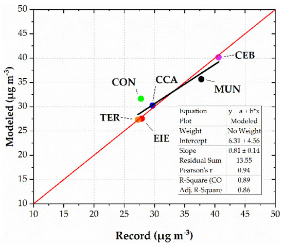 Maximum 24 h mean PM2.5 records and modeled concentrations from 31 December 2021 to 1 January 2022. Dots and nomenclature correspond to the six stations measuring PM2.5 concentrations. The black line indicates the linear fit between records and modeled values. The red line corresponds to a perfect fit.