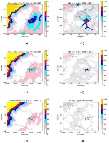 Modeled maps of temperature and planetary boundary layer (PBL) depth for selected hours: 31 December 2021 at 18:00 LT (a,b), 31 December 2021 21:00 LT (c,d), and 1 January 2022 at 00:00 LT (e,f).