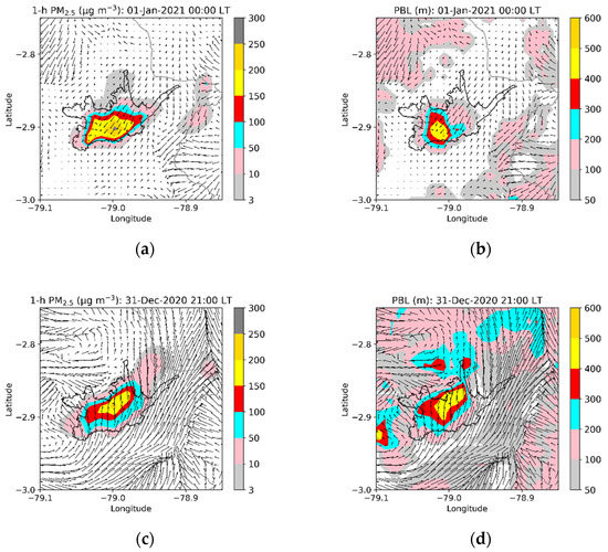 Modeled maps of PM2.5 and planetary boundary layer (PBL) depth. Reference scenario: New Year’s emissions starting on 1 January 2021 at 00:00 LT (a,b). Scenario with New Year’s emissions starting on 31 December 2020 at 21:00 LT (c,d).