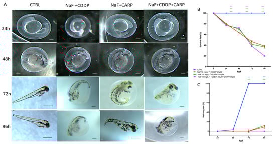 The morphological abnormalities in zebrafish caused by different NaF associations:NaF 10 mg/L−1 + CDDP 25 μM; NaF 10 mg/L−1 + CARP 100 μM and NaF 10 mg/L−1 + CDDP 25 μM + CARP 100 μM (A), survival rate (B), and hatching rate (C). Images were taken from the lateral view under a dissecting microscope (magnification 25). Scale bar, 500 mm.