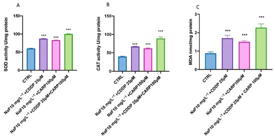 Effects of Naf 10 mg/L−1 + CDDP/NaF 10 mg/L−1 + CARP/NaF 10 mg/L−1 + CDDP + CARP exposure on activities of SOD (A), CAT (B) MDA (C), in the larval zebrafish. Embryonic zebrafish was exposed to these solutions from 24 to 96 hpf. Data are expressed as the mean ± SEM of three replicates (about 20 larvae per replicate). The asterisk denotes a statistically significant difference when compared with the CTRL: *** p< 0.0001 versus control.