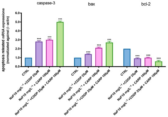 The NaF associations groups exposure effects on cell death zebrafish embryos. Related gene expression levels of apoptotic pathway in zebrafish embryos exposed to NaF 10 mg/L + CDDP 25 μM (A); NaF 10 mg/L−1 + CARP 100 μM (B); NaF 10 mg/L−1 + CDDP 25 μM + CARP 100 μM (C). The fold change from the CTRL group is considered to reflect the mRNA expression levels. *** p < 0.001 versus control.
