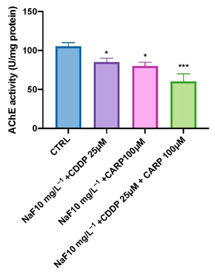 As shown in Figure 4, all treatments appear to have a decreased AChE activity, with NaF 10 mg/L + CDDP 25 μM and NaF 10 mg/L−1 + CARP 100 μM groups and mostly NaF 10 mg/L−1 + CDDP 25 μM + CARP 100 μM group significantly inhibited.