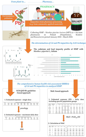 The graphic summary of the applied strategies in our comprehensive HHRA of Cd and Pb impurities in analyzed HMP with Mentha × piperita L., folium is shown in Figure 1.