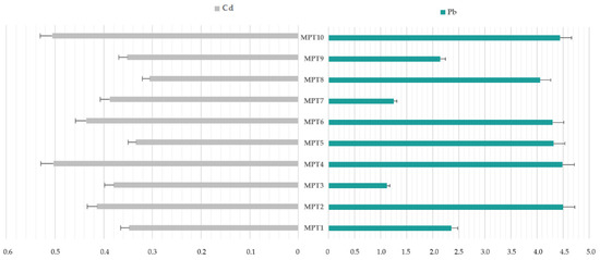 Although this is not the direct aim of this publication, the Pb/Cd ratio can be applied to try to link the samples together from an environmental point of view, i.e., if the ratio of Pb/Cd is similar in the concerned samples, it is likely that these products were obtained from the same raw material. It follows that the origin of the raw materials can be “delineated” as a specific toxicological fingerprint (Pb/Cd ratio). In this context, the similarity of the pairs can be noticed: PTM1–PTM-9, PTM2–PTM6, PTM3–PTM7, PTM4–PTM10, and PTM5-PTM8. It should be noted, however, that these are only assumptions and are not substantiated by other information.