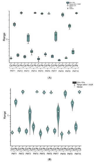 (A) The range of Cd and Pb impurities levels in all investigated herbal medicinal products with Mentha × piperita L., folium (PTM1–PTM10) as the plotbox (log scale). (B) The violin plot showing values of Cd and Pb impurities level (log scale) in all investigated herbal medicinal products with Mentha × piperita L., folium (PTM1–PTM10).