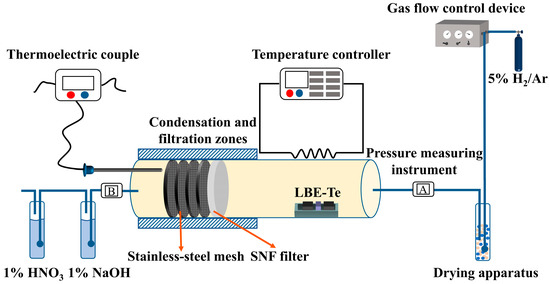 The Te evaporated from the LBE in the current experimental setup could be captured by the SiO2 nanofiber membrane, collected by the stainless-steel mesh installed after the SiO2 membrane, and deposited on the stainless-steel tube wall before the filtration membranes. The Te filtration efficiency η by the SNFs can be evaluated with the following equation (Equation (1)):