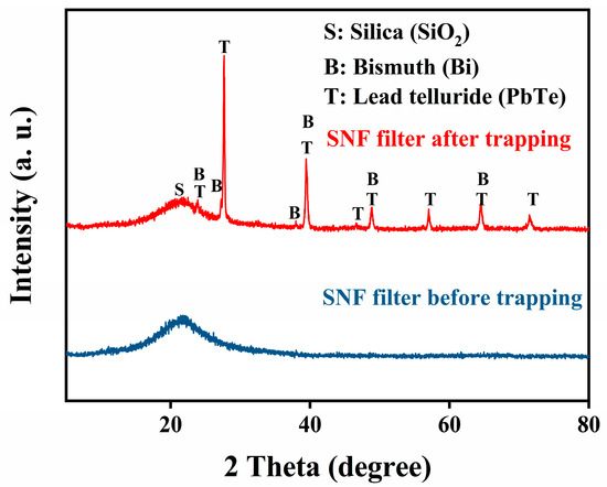 The corresponding phase structures of the unused SiO2 nanofibers and the LBE-Te@SiO2 nanofibers were analyzed by XRD, as shown in Figure 2. The SiO2 nanofibers showed pure amorphous features with only a small envelope of diffraction peaks around 21°. In contrast, the XRD pattern of the obtained LBT-Te@SiO2 specimen revealed the characteristic reflections of an intermetallic PbTe phase around 23.8°, 27.6°, 39.4°, 46.6°, 48.8°, 57.0°, 64.4°, and 71.5°. The XRD patterns also showed the existence of a pure metallic Bi phase with diffraction angles of 27.2° and 37.9° and overlapping peaks with the PbTe phase at 23.8°, 39.4°, 48.8°, and 64.4°. No elemental lead or Te was detected from the XRD analysis. It is therefore strongly suggested that the Te that vaporized from the LBE was mainly in the form of PbTe, which to some extent confirmed that PbPo would be the main component in the cover gas in a real operating lead-based reactor [10,37,41,42].