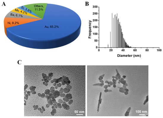Ultraviolet-visible (UV-Vis) absorption spectra were collected using a UV2450 spectrophotometer (Shimadzu, Kyoto, Japan). Dynamic light scattering (DLS) and zeta potential were measured using the Zetasizer Lab Blue instrument (Malvern Panalytical, Malvern, Worcs, UK). Transmission electron microscopy (TEM) imaging was performed in a Hitachi HT7800 TEM system at 100 kV. Elemental content was determined by iCAP RQ inductively coupled plasma mass spectrometry (ICP-MS) (Thermo, Waltham, MA, USA). For ICP-MS measurements in single-particle mode (spICP-MS), experiments were conducted on a NexION 350X ICP-MS instrument (PerkinElmer, Waltham, MA, USA), which was equipped with Syngistix Nano application software.