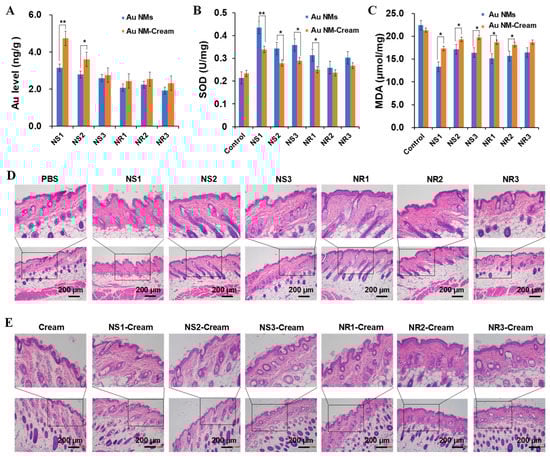 29]. In the present study, a commercial facial cream was characterized to contain spherical and rodlike Au NMs; however, the quantity of Au NMs was not enough for the systematic toxicity investigation, and the individual types of Au NMs could not be purified for clarification of their toxicity profiles. Based on this difficulty, various citrate-coated Au NSs and Au NRs were prepared and further embedded into and extracted from cosmetics, affording sufficient extracted Au NMs for deep understanding of the changes in the physicochemical property. The primary sizes, morphologies, and optical properties of extracted Au NMs were found to be similar to those of raw Au NMs; however, the hydrodynamic sizes of extracted Au NMs were significantly enlarged, and their zeta potentials were changed to more negative. For cytotoxicity assessments, Au NS1 showed weak cytotoxicity against HaCaT cells at the highest dosage, while Au NS1-Cream could reduce the toxicity. Au NS2-3 and Au NR1-3 showed little cytotoxicity, while Au NS2-3-Cream and Au NR1-3-Cream could weakly and significantly promote the cell proliferation, respectively. For the dermal safety evaluation in hairless mice, all these Au NSs and NRs were found to be able to accumulate in skin tissues after 30 days of treatment, and Au NS-Cream and Au NR-Cream could further enhance this accumulation; however, there was no Au accumulation in major organs, meaning that these Au NSs and NRs cannot enter the bloodstream and be transported to the major organs. These Au NMs and the Au NM-Cream showed little alteration in the epidermis and dermis of hairless mice, but they caused SOD elevation and MDA reduction to some extent, where Au NM-Cream showed a weaker response than the Au NMs, further demonstrating the toxicity alleviation effect of cream on Au NMs.