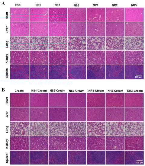 Mice were randomly divided into 14 groups (three mice per group): control (PBS), Au NS1, Au NS2, Au NS3, NR1, NR2, NR3, control (Cream), Au NS1-Cream, Au NS2-Cream, Au NS3-Cream, Au NR1-Cream, Au NR2-Cream, and Au NR3-Cream. Prior to treatment, the backs of mice were shaved to create a 2 cm × 1 cm area, and various Au NMs (6.1 ng cm−2) or Au-Cream (3.3 mg cm−2) were dripped onto the exposed skin through uniform spreading. After 8 h of treatment, the treated skin area was gently washed with lukewarm water and dried with medical cotton. Mice were treated once a day for 30 consecutive days. At the end of treatment, mice were anesthetized intraperitoneally with a xylazine (50 mg kg−1)/ketamine (50 mg kg−1) solution, and their blood was collected by eye removal method for further blood routine examination. Then, mice were sacrificed, and the treated dorsal skin and major organs (liver, spleen, kidneys, lung, and heart) were retrieved and sectioned for hematoxylin and eosin (H and E) staining.