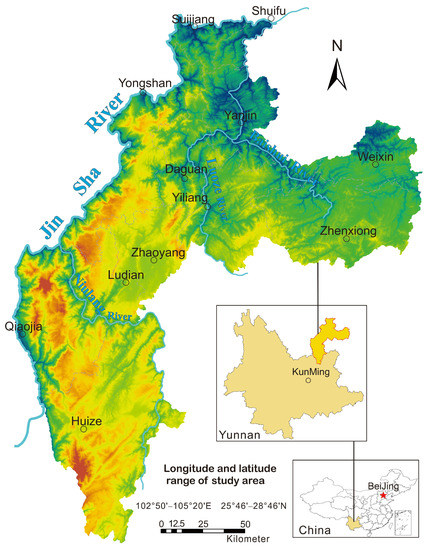 The study area is located in northeastern Yunnan Province, southwestern China. The geographical coordinates are 102°50′–105°20′ E, 25°46′–28°46′ N, covering approximately 28,066 km2. The administrative division is under the jurisdiction of Zhaotong and Qujing (Figure 1). The study area has a plateau monsoon three-dimensional climate with both plateau subtropics and warm temperate zones, with an average annual temperature of 12.6 °C. The highest altitude in the area is 4025 m, and the lowest altitude is 175 m, which belongs to the deep-cut alpine landform, and most of the area is composed of carbonate karst. Various types of land resources are scattered in the area because of the influence of topography and landform diversity, and the land-use types are diverse and complex. The predominant land-use types in the study area are forestland and grassland, accounting for 58.6% of the total land area, while agricultural land accounts for only 35.5% [30]. The area is mainly based on agricultural planting, and the special landform provides unique conditions for agricultural production in the area; at the same time, the unique landform necessitates higher requirements for adapting agricultural production to local conditions. The research area is located in the middle and upper reaches of the Yangtze River and is located in the watershed area of the Jinsha River, the Niulan River, and the Luoze River, with other water systems running through it. It is an important soil and water conservation area. In recent years, the ecological environment in the region has deteriorated; for example, serious soil erosion, sharp reductions in forest resources, and soil pollution caused by deposit mining occur frequently, and it is necessary to evaluate the ecological environmental risk posed by soil in the area.
