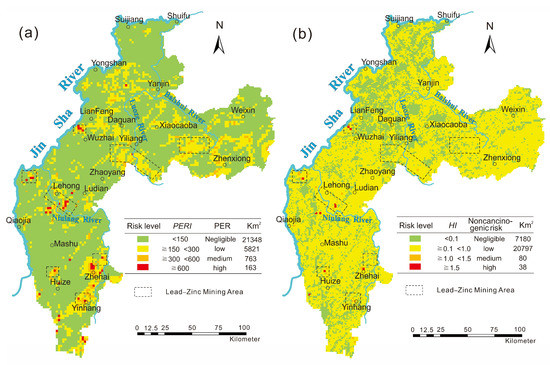 Spatial distribution of the compound ecological risk index (RI) (a) and hazard index (HI) (b) of heavy metals in surface soil.