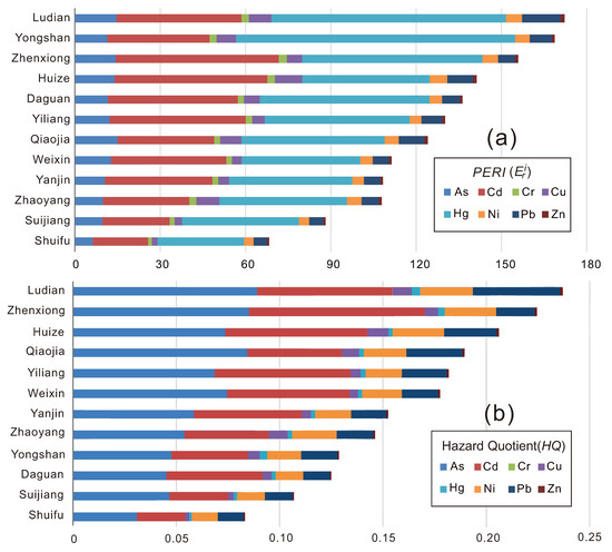 Average values of the potential ecological risk index () (a) and hazard quotient (HQ) (b) of heavy metals in the study area.