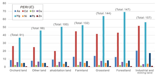 Average ecological risk index () of heavy metals in different land uses.
