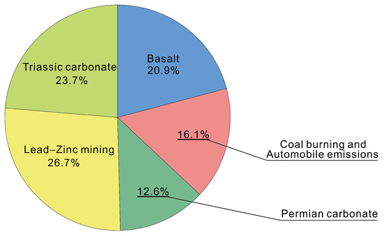 The soil heavy metals in the study area mainly comes from five sources, of which parent material such as basalt, Permian, and Triassic carbonate rock constitutes the natural geological background source, the mining activities of lead–zinc mines and the emissions of coal burning and automobile exhaust from residents constitute an anthropogenic source. The accumulation of heavy metals by mining activities contributed the most to the soil. The total contribution of the five sources followed a descending order: lead–zinc mining (26.7%) > Triassic carbonate (23.7%) > basalt (20.9) > coal burning and automobile emissions (16.1%) > Permian carbonate (12.6%).